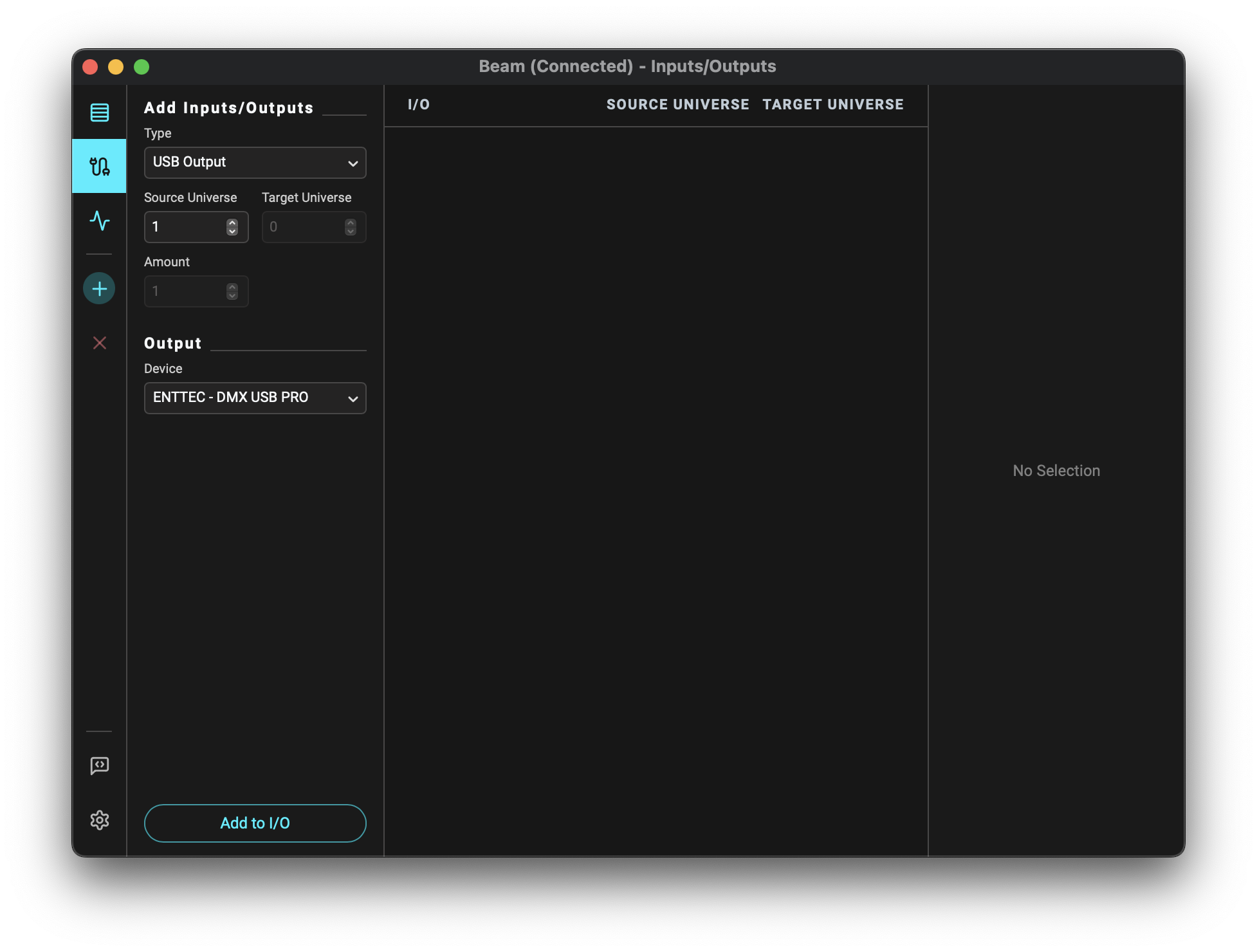 Selecting an output device in Beam for Live 2 works a bit differently than in 1.x, as it is now possible to have multiple input and output universes from and to different source and target devices.
