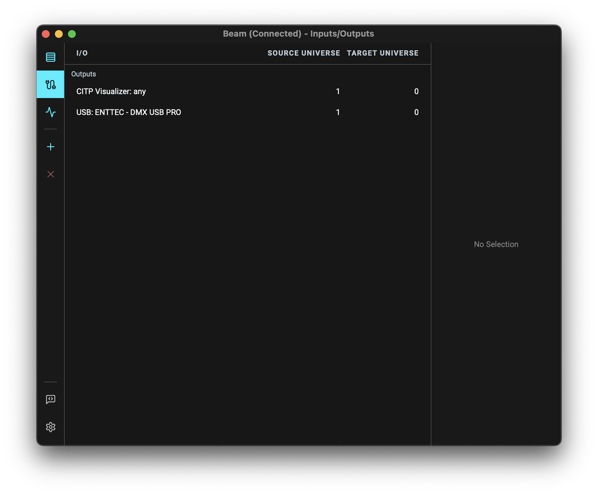 But in Beam’s I/O page I’m not even seeing the Enttec device, instead I’m seeing something called CITP Visualizer:any.