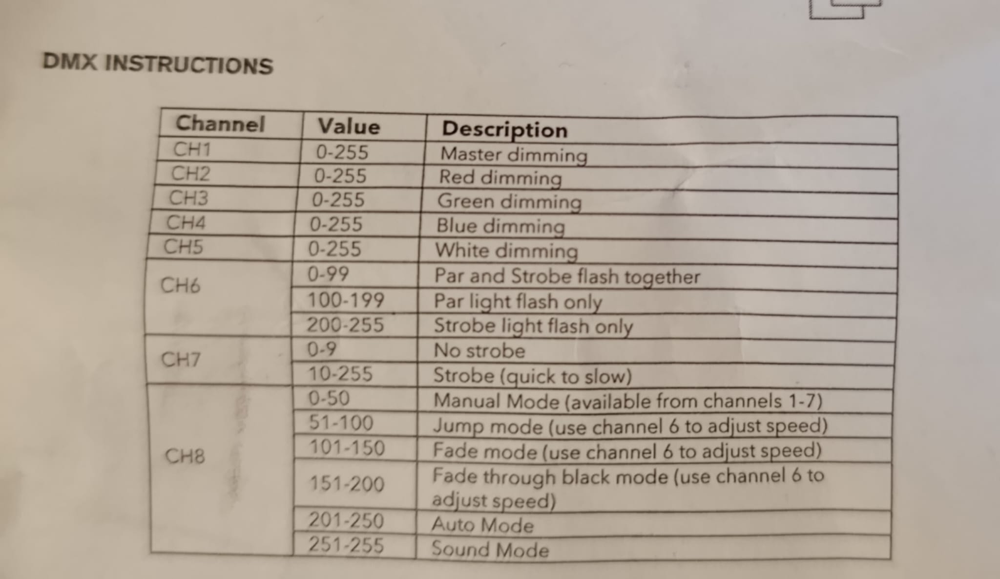 rgb colorspace, DMX channels: Red 255, Green 255, Blue 255(there is no dedicated white LED, so we need to create it with a combination of red, green and blue LED diodes)