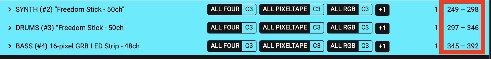 The last 3 fixtures in your patch have overlapping DMX channels/addresses, which may result in unexpected behavior - the last channel of SYNTH (#2) "Freedom Stick - 50ch"