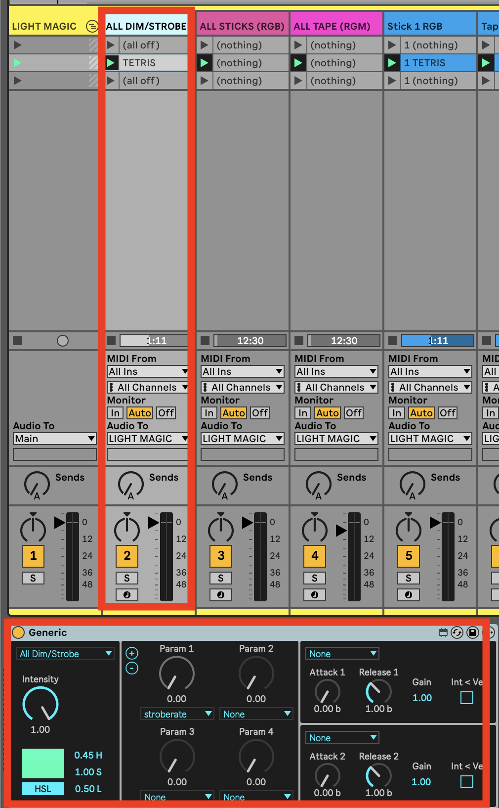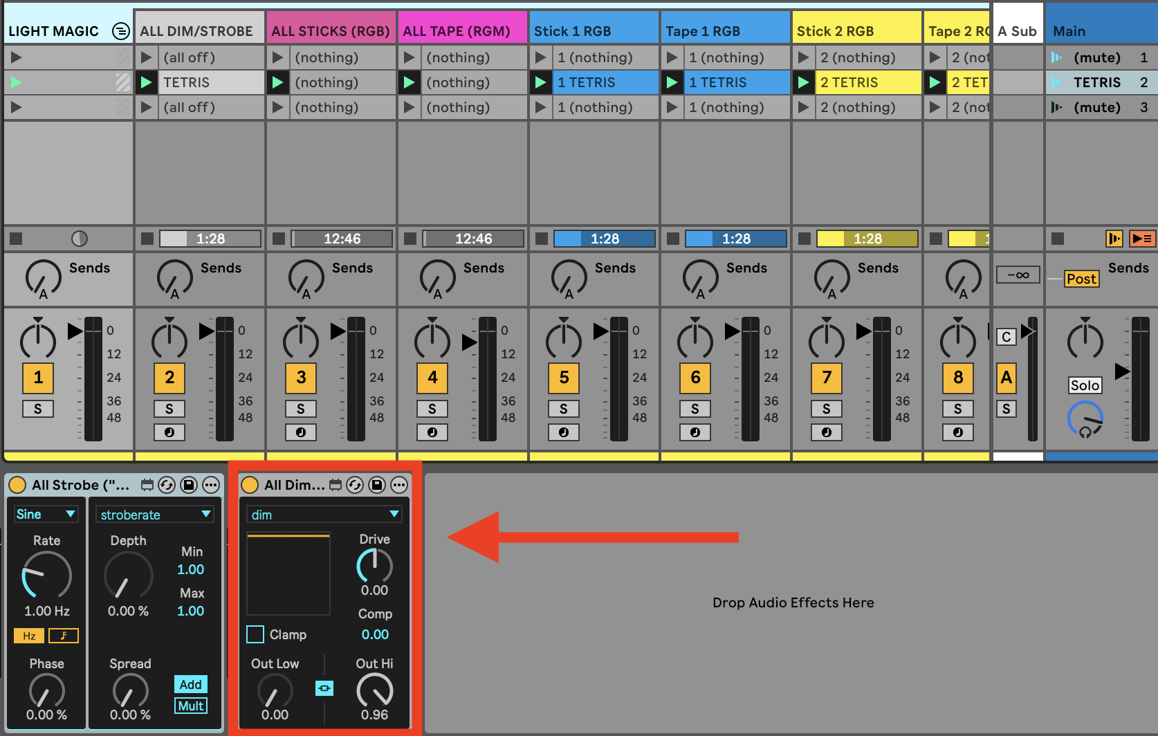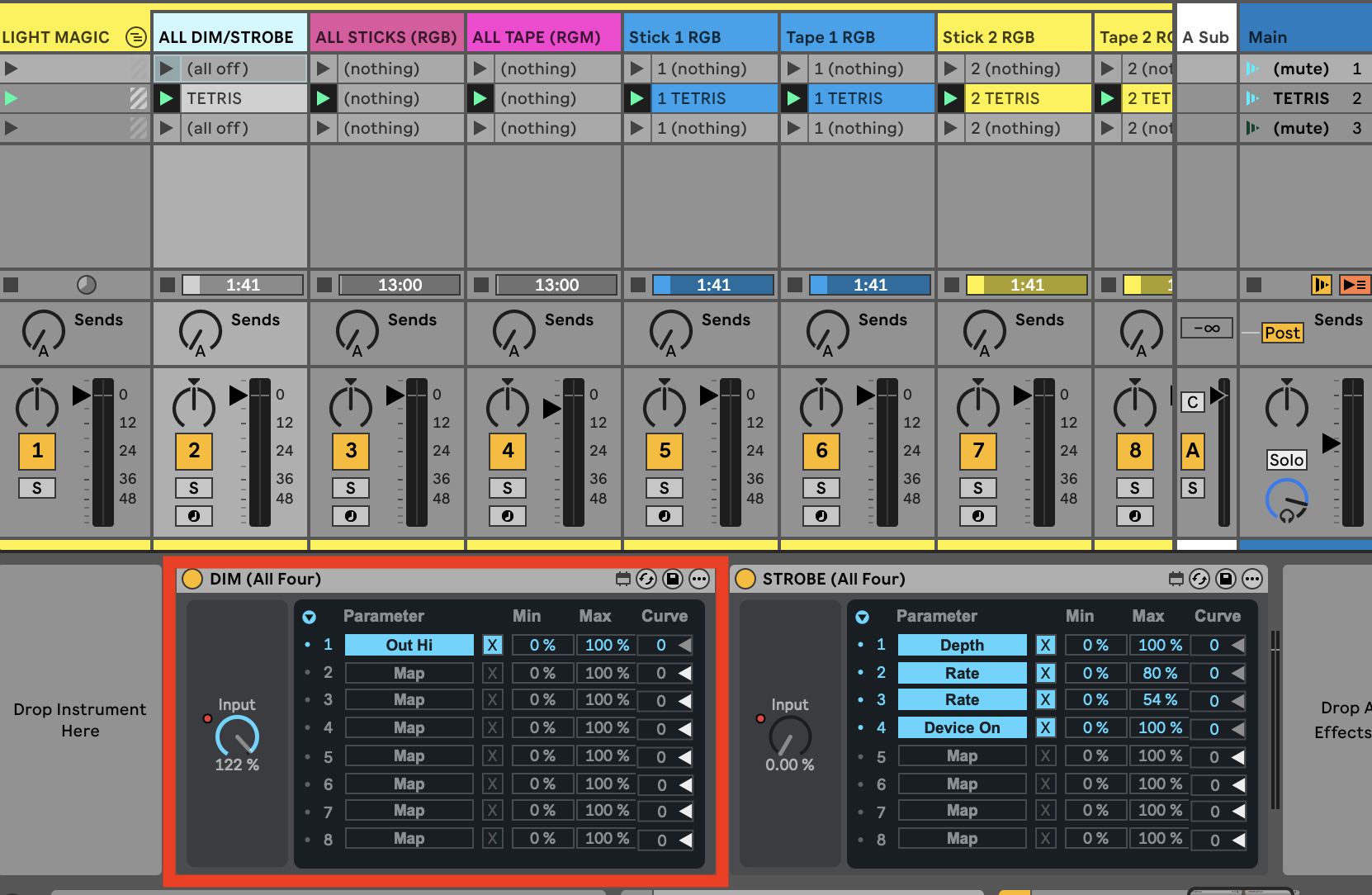 Thanks for sharing the fixture patch. When you trigger the TETRIS scene, the MultiMap device in the ALL DIM/STROBE track sets dim