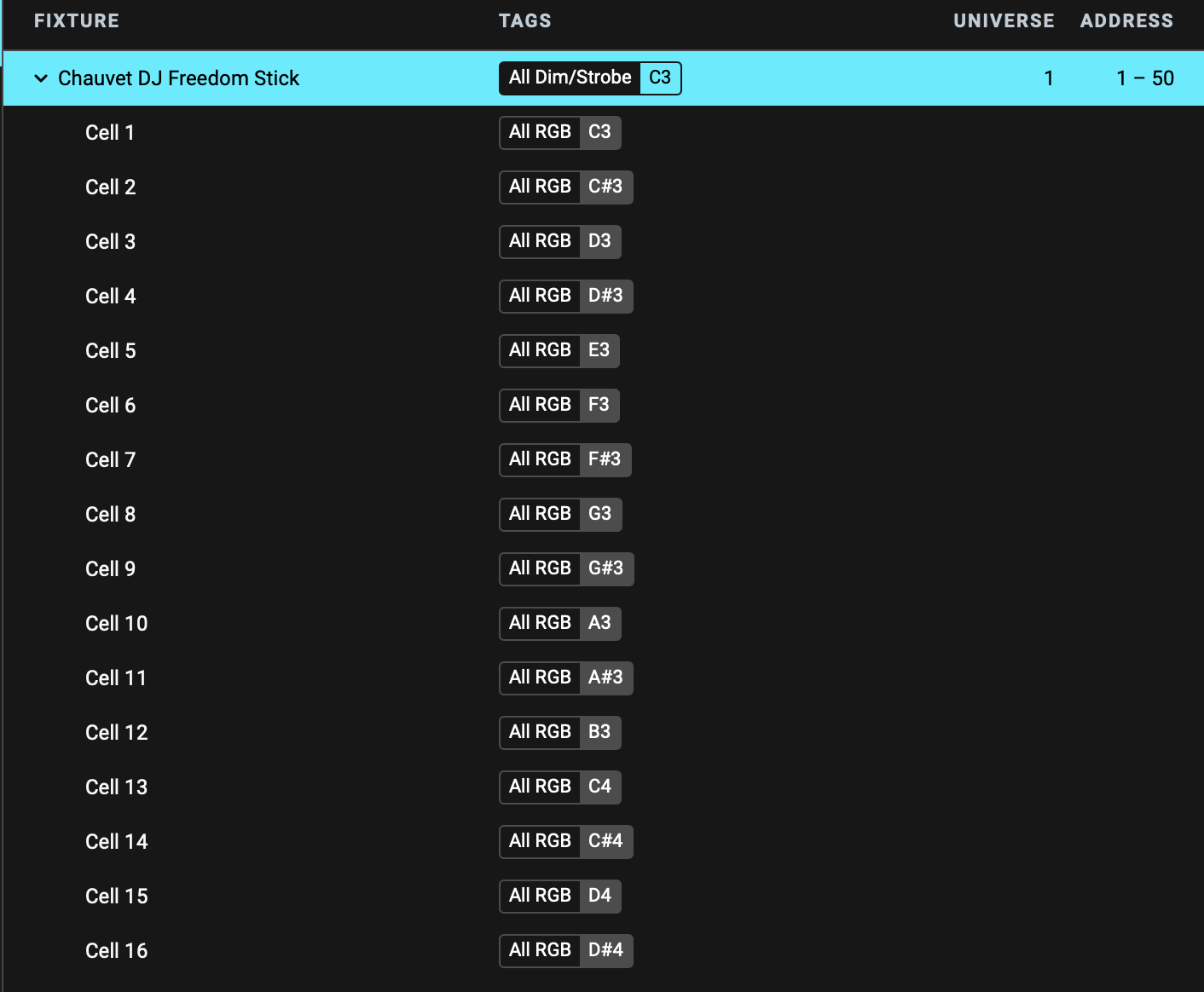 sections of the fixtures in the fixture patch, and use a dedicated device/track just to control that tag, where Intensity can just be set to 100% at all times, with actual intensities set via the tags assigned only to the fixture children/cells: