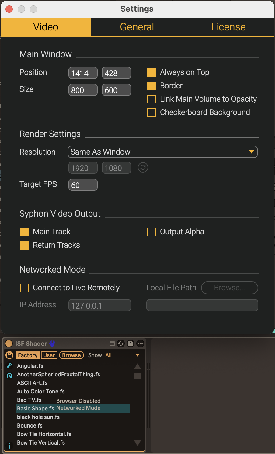 In Videosync 2.0.12 (252), the ISF Shader device seems to always show the message “Browser Disabled Networked Mode”. I’ve never seen this message before, and I don’t believe I’m in networked mode: