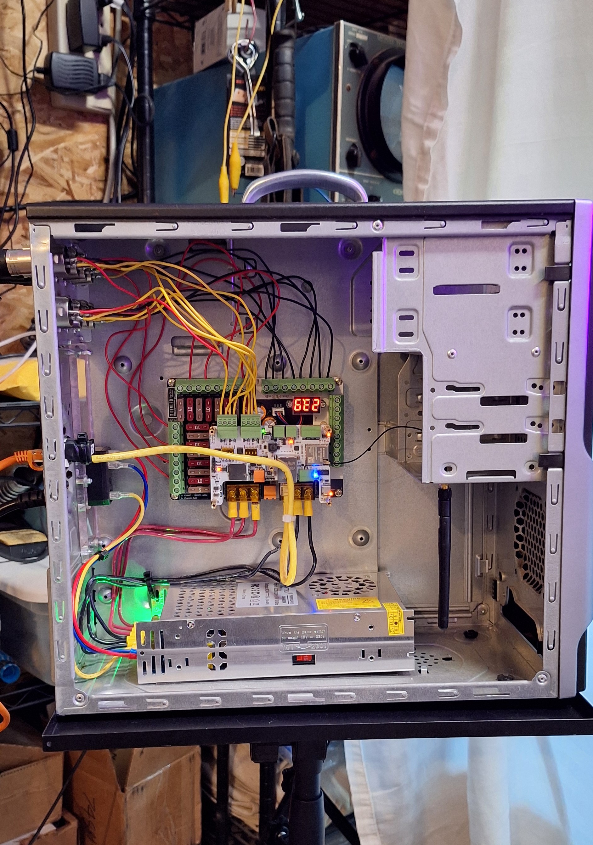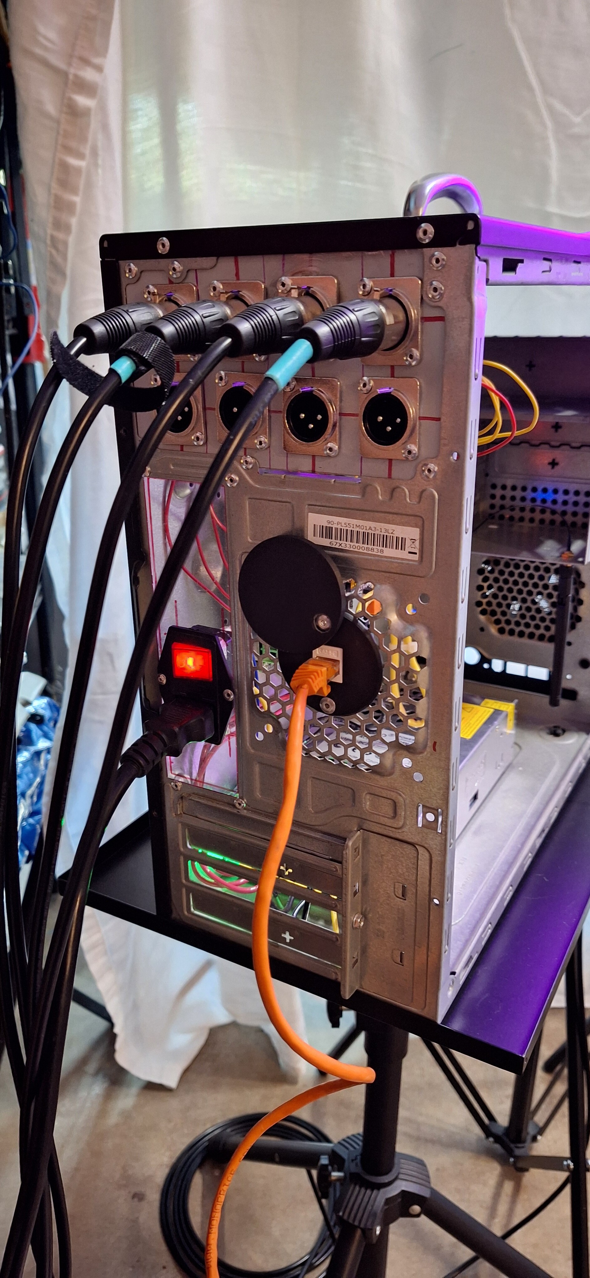 Old pc case housing the power supply, power management board, brain board, 3 conductor wire xlr ports, and ethernet(Artnet) port.