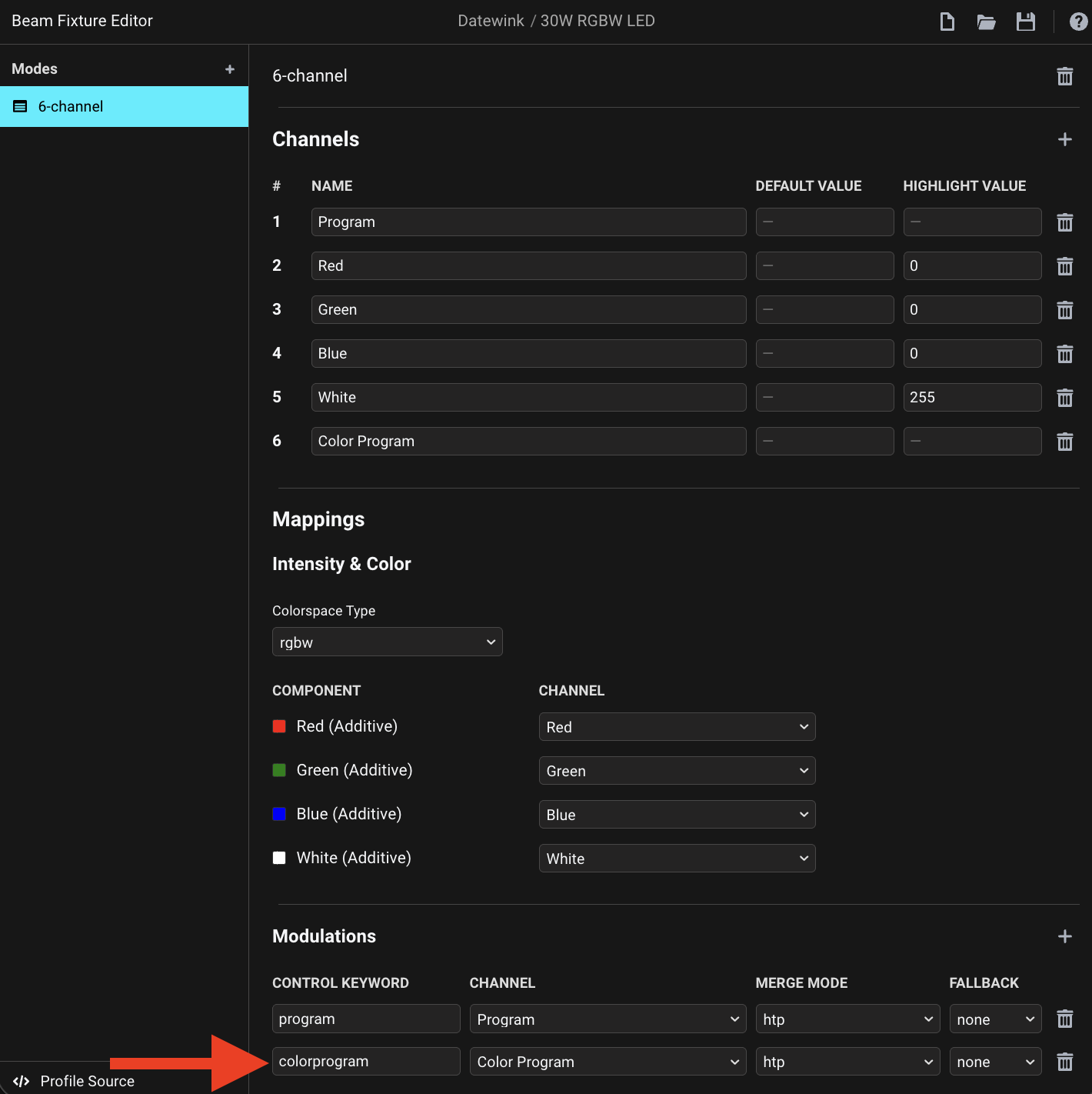 You can download the finished profile here: Datewink 30W RGBW LED.sbf (1.3 KB), but I recommend creating it yourself, just so you’ll get the hang of it