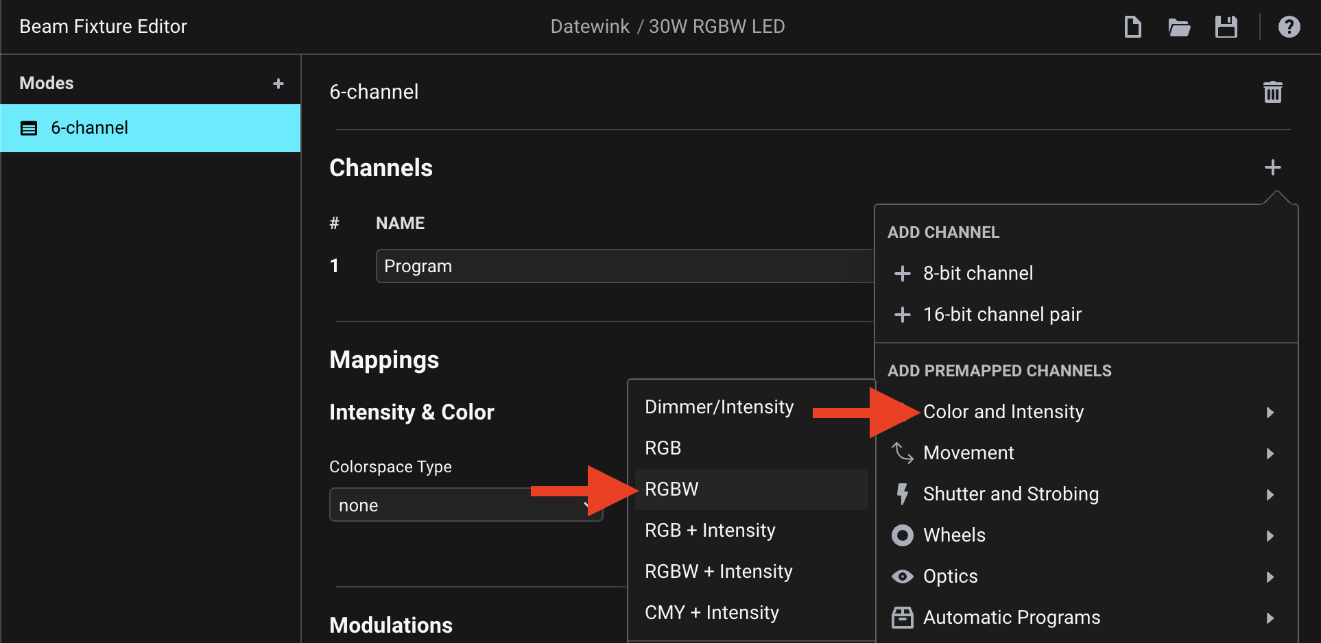 Next, we’ll need to add the RGBW channels, which we can also easily select from the + menu: